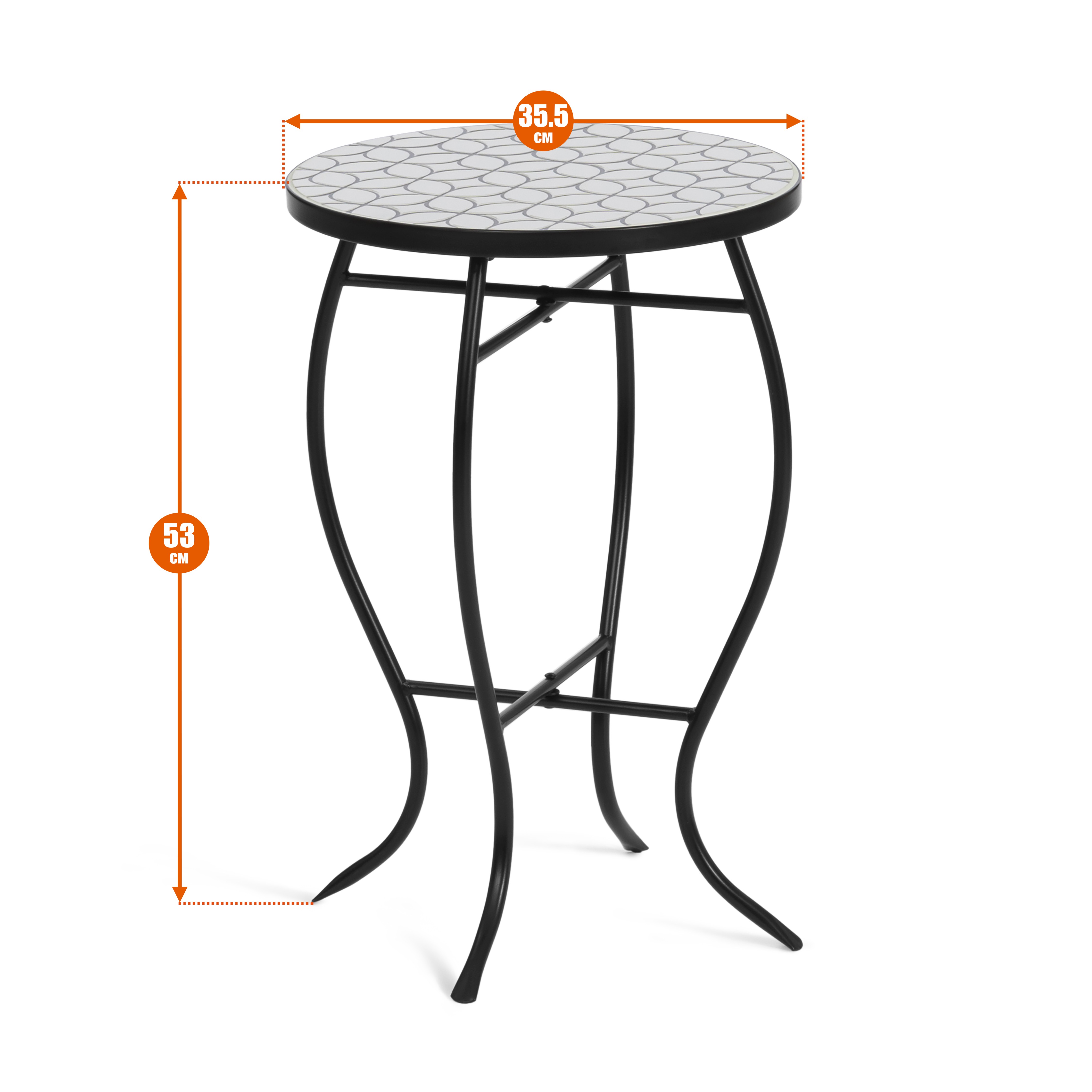 Компактный декоративный столик Secret de Maison Дижон/Dijon— стильное и практичное решение для балкона, террасы, дачи или интерьера. Модель выполнена из прочного металла в сочетании с элегантной столешницей из белой мозаики и черного металла, что придает изделию изысканный европейский стиль и делает его акцентным элементом в любом пространстве. Круглая форма и компактные размеры (диаметр 35,5 см, высота 53,5 см) позволяют использовать столик даже в небольших помещениях — на балконе, лоджии или в уютной зоне отдыха. Металлическая конструкция обеспечивает устойчивость и надежность, а максимальная нагрузка до 40 кг позволяет использовать столик не только как декоративный, но и как полноценный функциональный элемент мебели — для напитков, книг, аксессуаров или декора. Благодаря универсальному дизайну столик гармонично вписывается как в домашний интерьер, так и в уличное пространство, подходит для использования в саду, на террасе, в кафе или зоне отдыха. Столик Дижон/Dijon—можно использовать как кофейный столик, приставной столик, садовый столик или столик для балкона. Он идеально подходит для дачи, террасы, кухни или небольших помещений, где важны компактность и функциональность. Модель требует сборки, при этом конструкция проста и удобна в установке. Этот металлический столик с мозаикой сочетает в себе прочность, устойчивость, компактность и эстетичный внешний вид, что делает его отличным выбором для тех, кто ищет маленький столик для балкона, садовый столик, кофейный или декоративный столик для дома и улицы.
